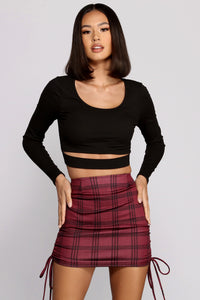Serve up the tea in a fab crop top that slays. The top features a scoop neckline, a cropped hem with an under band accent, and composed of a ribbed knit fabric. Complete your look with high waist pants.