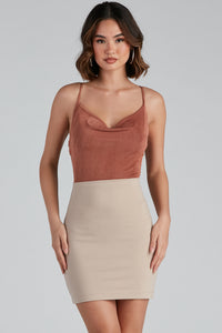 Simple and sultry, this slinky knit bodysuit is a chic must-have. It features a sleeveless draped cowl neckline, spaghetti straps that lead to a cross-back design, a high waist seam, and a thong bottom. Style this bodysuit with faux leather pants and clear mules.