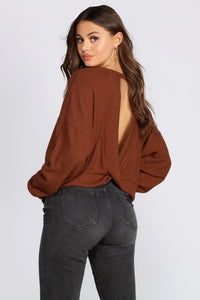 Layer up in this soft knit top with a trendy open back detail! It features a crew neckline, long dolman style sleeves with ribbed cuffs, and open back with a wrap detail, and a mid-length, ribbed knit hem. The knit fabric offers plenty of stretch and an overall relaxed and comfortable fit.
