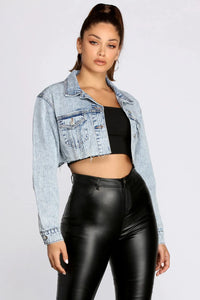 The styling possibilities will be endless with this trendy denim jacket! It features a collared neckline, long sleeves with button cuffs, a complete button-down front, dual chest pockets, a cropped relaxed fit with a raw edge frayed hem, and is composed of an acid wash denim fabric with destructed detailing. Pair it over a basic crop top with faux leather pants to add some flair.