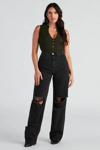 So effortlessly edgy and cool, these high-rise denim jeans feature an on-trend wide-leg silhouette with distressed accents and knee rips to flaunt your bad-girl status! Complete the look in a sultry bustier and heels.