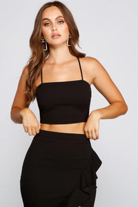 Bring those baddie vibes babe in this super-flattering knit crop top! It features thin straps and criss-cross back straps. Wear it with the matching bodycon skirt for a night out to remember!