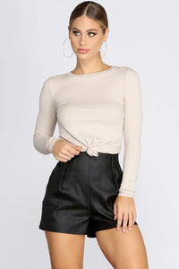 Add a trendy touch to your look with this cute crop! The top features a crew neckline, long fitted sleeves, a cropped hem, and a knot front detail. The ribbed knit fabric offers plenty of stretch and a form-fitting style.