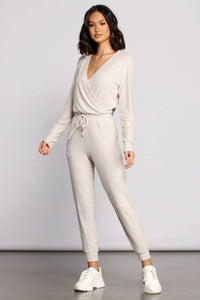 Keep it casual in a jumpsuit that is soft to the touch! The must-have jumpsuit features a plunging surplice neckline, an adjustable drawstring waist, side pockets and straight leg pants. The jumpsuit is composed of a ribbed cashmere-like fabric that offers a relaxed fit. Style with sneakers for a low-key affair.