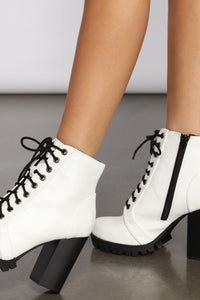 Lace-up in booties that bring the edge to your look! Create a stylish grunge outfit with these must-have booties! The booties feature an around the ankle fit, a lace-up front, and a lug sole with a block heel. Complete your look with a graphic tee and high waist pants.