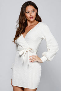 Keep it cozy with a mini dress that is perf for a casual date night! The dress features a wrap V-neckline, long balloon sleeves with ribbed cuffs, a cinching tie waist with belt loops, and a mini-length silhouette. The dress is composed of cable knit fabric that offers a form-hugging fit with a moderate stretch. Complete the look with ankle booties.