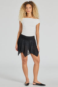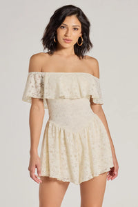 Look like a daydream in this boho lace romper designed with a ruffled off-the-shoulder neckline and a flattering skater silhouette.