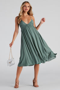 Let the sun kiss your shoulders in this flowy midi dress! It features a sleeveless ruched v-neck and spaghetti straps that lead to the sultry open-back with a lace-up closure. Complete the look in trendy sandals.