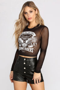 Want that edgy chic rocker girl vibe? Pair this mesh crop top with a pair of faux leather shorts and some booties and you've got your look!