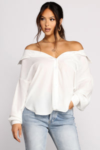 You'll be a total classic cutie in this chic oversized tunic! It features a complete button-down front and an adjustable back strap, giving you the option to style it with the collar or give it an off the shoulder look. Pair this top with light wash denim and heeled mules for an effortless everyday vibe.
