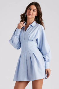 Step out in this perfectly striped shirt dress to look cute for picnics in the park, family gatherings, or graduations! It features long sleeves with buttoned cuffs, a collar v-neckline, a corset-seam illusion waist, a cutout lace-up back design, and a short skater silhouette. Complete the look with teardrop earrings.