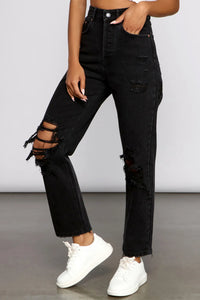 Elevate your style with chic jeans that make your look stand out. The jeans feature a high-rise waist, a multi-button front, a five-pocket design, moderate destruction, and a straight leg with boyfriend fit. Complete the look with a graphic tee shirt.