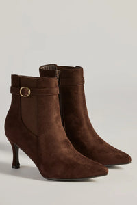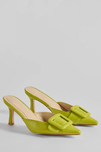 - Closed pointed-toe with belt accent