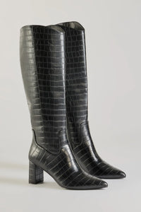 Make a bold statement with faux leather under-the-knee boots that feature a trendy croc-embossed pattern, a pointy toe, and a block heel. Complete with a midi dress for the perfect office to happy hour outfit!