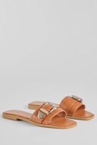 It's impossible not to make an iconic fashion statement in these faux leather sandals! Featuring a sleek square toe, a flat sole, and a Western-inspired buckle along the strap for added flair. Complete the look with a trendy denim jacket.