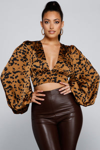 Achieve a chic look for the fall season with this on-trend crop top. It features long dramatic puff sleeves, a deep V-neckline, faux button details, and a cropped fit. The sleek satin fabric has an all-over leopard print for a stylish vibe. Complete the outfit with dark wash denim and mules.