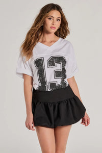 This sporty graphic tee features a V-neckline, short sleeves, a "13" faded front graphic, and the perfect oversized fit. Style with a mini skirt and sneakers for game day!