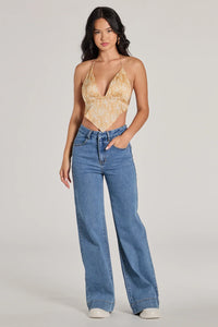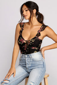 Channel romance in a lacy bodysuit that brings the charm. The bodysuit features a plunging scoop neckline, ruffled shoulder straps, and a floral print bodice. Complete look with high waist jeans.