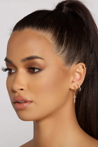 Set up your look with trendy earrings that add the finishing touch to any look! The pack includes five pairs of earrings featuring a cross charm, huggies, and ear cuff design. Complete your look with a crop top and high waist jeans and you're ready to go!