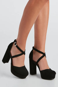 Have yourself an it-girl moment in these fab platform pumps! Featuring a closed toe with an added platform, thin criss-cross straps, and a tall block heel, these pumps are perfect for a night out. Style with a mini dress and a cute handbag.