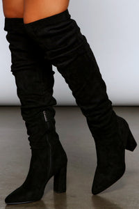 Hit the style mark with boots that complete your layered outfits! The boots feature an over-the-knee fit, an inner zipper closure, ruching, a pointed toe, and a block heel. The boots are composed of a faux suede material. Complete look with a chunky cable knit sweater and skinny jeans.