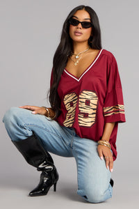 Sporty, oversized, and just the right kind of extra—this V-neck jersey top brings a wild twist with bold tiger-print numbers and sleeve stripes. Throw it on with denim, minis, or workout shorts whenever you want your casual fit to feel effortlessly cool.