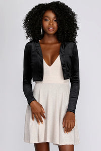 Perfect to add to any formal dress, this bolero features a short tailored hem, long sleeves and a collarless design. This bolero cover up is composed of a velvet material that offers a form fit.Special Occasion products cannot be returned to any retail locations.