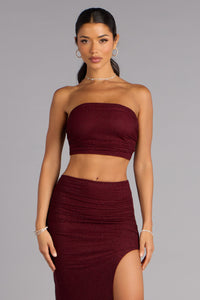 This tube top brings that chic, sculpted shine that makes you feel instantly elevated. The rhinestones catch every hint of light, giving you that glam confidence boost the moment you slip it on. Style with the matching maxi skirt.
