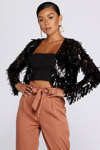 Party on till the break of dawn! This jacket is the epitome of fun, featuring an open design, long sleeves and a cropped hem. The star of the show is the shaggy style long sequins that twist and twirl with you as you dance the night away! Jacket is composed of a sheer mesh material that offers minimal stretch.Style Number/Barcode: 06204-0136