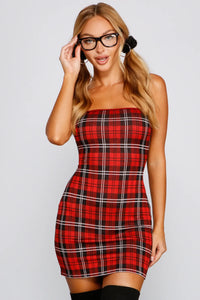 Break the rules with a mini dress that doesn't play it safe! The dress features a plaid print, a sleeveless square neckline, spaghetti straps, and a mini-length silhouette. The dress is composed of a brushed knit fabric that offers a form hugging fit with a moderate stretch. Complete look with thigh-high boots.