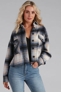 Channel those cozy vibes with a shacket that is perf to create those fab layers this season! The shacket features a plaid print, a collared neckline, a multi-button down front, two chest pockets, long sleeves, and a cropped hem. The jacket is composed of a woven fabric that offers a relaxed fit. Complete look with a bodysuit and jeans.