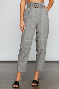 Stun like the chic fashionista you are with fab pants! The pants feature a high-rise waist, a belt with an O-ring buckle, belt loops, slant pockets, a plaid print, and a straight leg with a tapered hem. Complete look with a white top and mules.