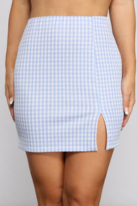 Get a perfect look this spring season in this adorable plaid mini skirt! It features a high-rise waist, a small side slit, and a short, curve-hugging fit. Pair this knit skirt with a cute crop top and clear heels.