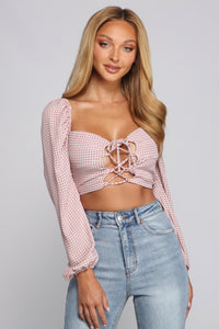 Lace-up in a cute gingham crop top for your next casual date! The top features a sweetheart neckline, a lace-up front, long sleeves, a cropped hem, and a gingham print. The top is composed of a lightweight woven fabric that offers a relaxed fit with minimal stretch. Complete look with high waist jeans.