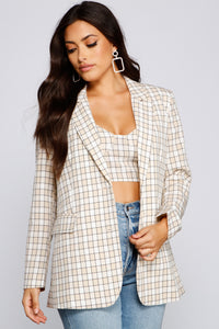 Keep it polished with a blazer that brings that sophisticated glamour. The blazer features a plaid print, a collared neckline with a lapel accent, a multi-button down front, front pockets, long sleeves, and an oversized fit. The blazer is composed of a woven fabric that offers a relaxed fit with slight stretch. Complete look with the matching bustier and jeans.