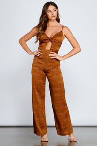 Keep it preppy and posh with a plaid jumpsuit that is perf for a stylish day out! The jumpsuit features a plaid print, sleeveless V-neckline, adjustable spaghetti straps, a twist-front accent at the bodice, and a cutout. The slim-fit bodice leads to a flared straight leg. Complete look with wedges and dainty rings.