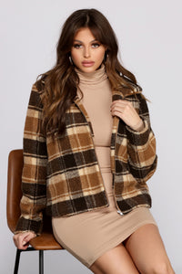 Keep it trendy in a plaid jacket that slays your layered outfits! The jacket features a fab plaid print, a mock neck, a zippered front, long sleeves, and is composed of a cozy wubby fabric that offers a relaxed fit with slight stretch. Complete look with a mock neck midi dress and ankle booties.