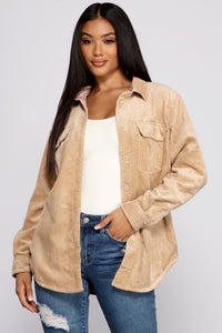 Be the trendy member of your squad in this adorable cozy shacket! It has a reversible design, with a corduroy fabric on the exterior and a soft woven flannel fabric on the interior. The jacket features a collared neckline, long sleeves with single buttons to cuff, a complete button-down front, top buttoned pockets on the exterior, and lower front pockets on the interior. Layer this relaxed-fitting shacket over a knit mini dress and pair it with chunky sneaks.