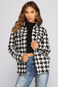 You'll be looking so chic when you layer on this trendy woven shacket! It features a collared neckline, long sleeves with single buttons to cuff, a complete button-down front, a relaxed fit, and a bold all-over houndstooth pattern. Pair this shacket with high rise denim and booties to elevate your casual look.
