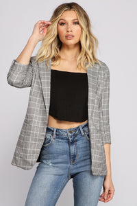 Get a poised and perfect outfit by layering on this chic plaid blazer! It features a lapel collar, shoulder pads, three quarter length cuffed sleeves, and faux front pockets. Pair this blazer over a little black dress for a stylish look for happy hour.