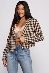 Keep it chic and professional in a blazer that stuns. The blazer features a houndstooth print, a collared neckline, long sleeves, a double-breast button closure, and a cropped hem. Complete look with a bustier and jeans for a casual vibe.