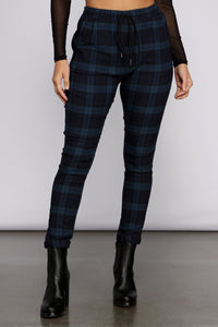 Give your everyday look a casual-chic vibe by styling up these plaid jacquard joggers! They feature a high rise elastic banded waist with a front drawstring, slanted front pockets and faux back pockets, and a tapered leg fit. Pair these pants with combat booties for the perf look for this season.