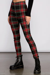 Casually slay your holiday look this season in these plaid pants! They feature a high rise elastic banded waist, a trendy zip front detail with an O-ring accent, and a tapered, skinny leg fit. The pants are composed of a stretchy knit fabric for comfortable wear. Pair these pants with ankle booties and a cropped knit sweater.