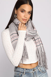 Get all cute and cozy in this knit plaid blanket scarf! It features a frayed hem design with fringe detailing and a soft to the touch fabric. Layer this scarf over a long sleeve bodysuit and denim for a classic fall look.