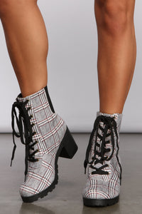 Keep it so fab in plaid booties that too glam to pass up! The booties feature a trendy plaid print, an around the ankle fit, goring at the back of the ankle, an almond toe, and a lug sole. Complete look with a faux leather mini skirt and crop top.