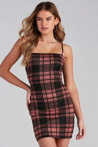 Get a pretty, picture-perfect look in this adorable plaid knit mini dress! It features a trendy square neckline and a short, curve-hugging silhouette. Layer on a chic jacket over this dress and style it up with heeled booties for a fall night out.