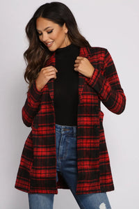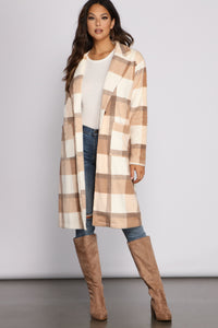 Keep your stylish look in check with this adorable plaid coat! It features a lapel collar with an open front and a mid-length hem. Pair this coat with a basic bodysuit and heeled booties for a city-chic look.