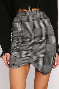 Elevate your style in a plaid skirt that is all the rage! The skirt features a high rise waist, a checkered houndstooth print, and a side slit. Complete your look with a black long sleeve top.