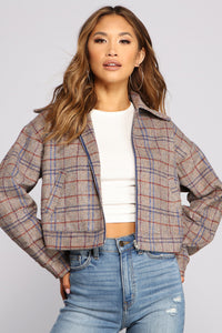 Get a perf look for a casual everyday style in this plaid jacket! It features a collared neckline, long sleeves, a complete zip front, and a cropped, oversized fit. Pair this jacket with light wash denim and heeled booties for a trendy feel.