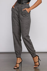 Stay on trend with plaid joggers that bring the chic factor. Perfect for creating stunning workwear outfits, the joggers feature a high rise waist, The pants feature a high rise waist, a single button closure with zipper, slant pockets, and a plaid print. Complete your look with a black bodysuit.